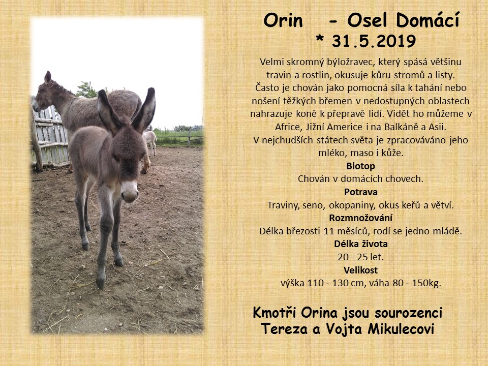 oslíček Orin *31.5.2019 - Orin své kmotry našel. Děkujeme sourozencům Mikulecovým.